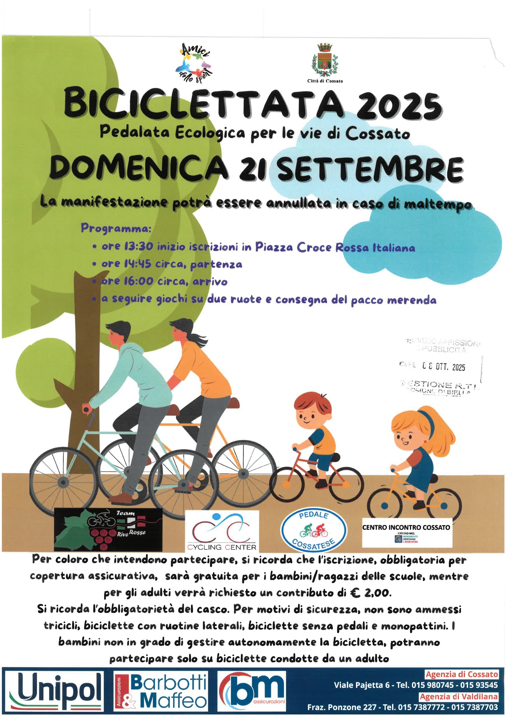 Torna anche quest’anno la Biciclettata Ecologica per le vie di Cossato, un appuntamento dedicato allo sport, alla socialità e al rispetto dell’ambiente, organizzato con la collaborazione del Comune di Cossato e delle associazioni locali.