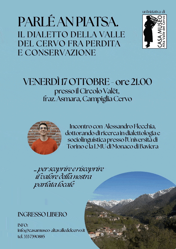 Venerdì 17 ottobre 2025 alle 21:00, al Circolo Valët (frazione Asmara, Campiglia Cervo), una serata dedicata alla parlata locale: l’incontro “Parlé an piatsa” è promosso dalla Casa Museo dell’Alta Valle del Cervo e vede come relatore Alessandro Flecchia, dottorando in dialettologia e sociolinguistica. A partire dagli studi condotti in valle, la conferenza introduce le peculiarità del valët, ne evidenzia le differenze rispetto ad altri dialetti biellesi e piemontesi e invita a riscoprirne l’uso quotidiano. Un appuntamento utile anche per chi studia lingua, storia locale e patrimonio immateriale.