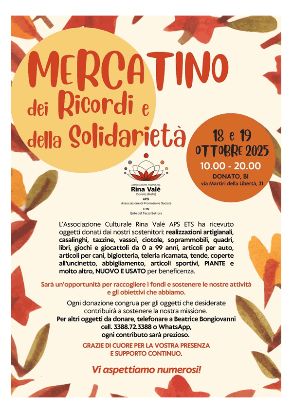 Nel centro di Donato (BI), presso la sede dell’Associazione Culturale Rina Valé in via Martiri della Libertà 31, torna il mercatino solidale di autunno: sabato 18 e domenica 19 ottobre 2025. In vendita oggetti nuovi e usati, modernariato e piccolo antiquariato; il ricavato sostiene le attività culturali e sociali promosse sul territorio. Un’occasione per chi ama il riuso e per chi desidera contribuire, anche con piccoli acquisti, alla vita associativa locale. Orari indicati in locandina.