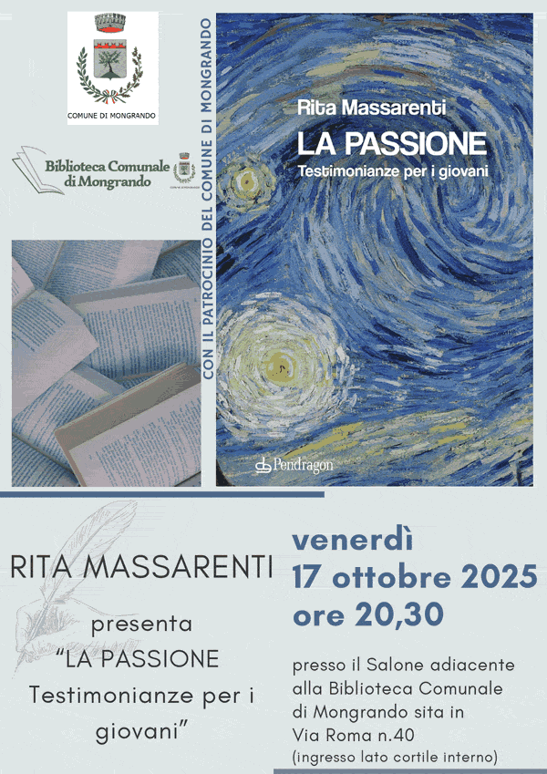 Alla Biblioteca Civica di Mongrando una serata dedicata ai temi della crescita e delle scelte giovanili con la scrittrice Rita Massarenti. L’incontro è in programma venerdì 17 ottobre 2025 alle 20:30 e prevede la presentazione del volume “La Passione. Testimonianze per i giovani”, con dialogo aperto al pubblico.
