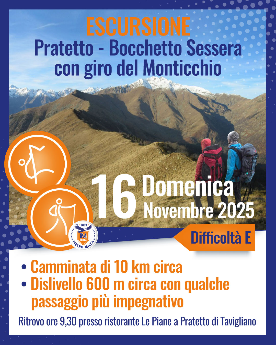Domenica 16 novembre 2025 si svolgerà una camminata guidata da un accompagnatore escursionista FIE, con partenza da Pratetto e itinerario che toccherà il Bocchetto Sessera e il Monticchio.