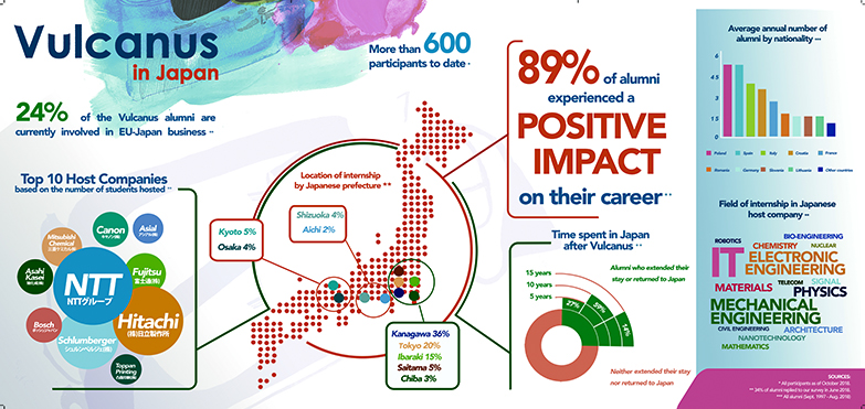Vulcanus in Giappone offre agli studenti dell’UE la possibilità di effettuare un tirocinio presso un’azienda giapponese. Il programma si svolge completamente in Giappone da agosto a marzo dell’anno successivo. Il programma intende accrescere e stimolare la cooperazione industriale e migliorare la comprensione reciproca tra Giappone e UE.
