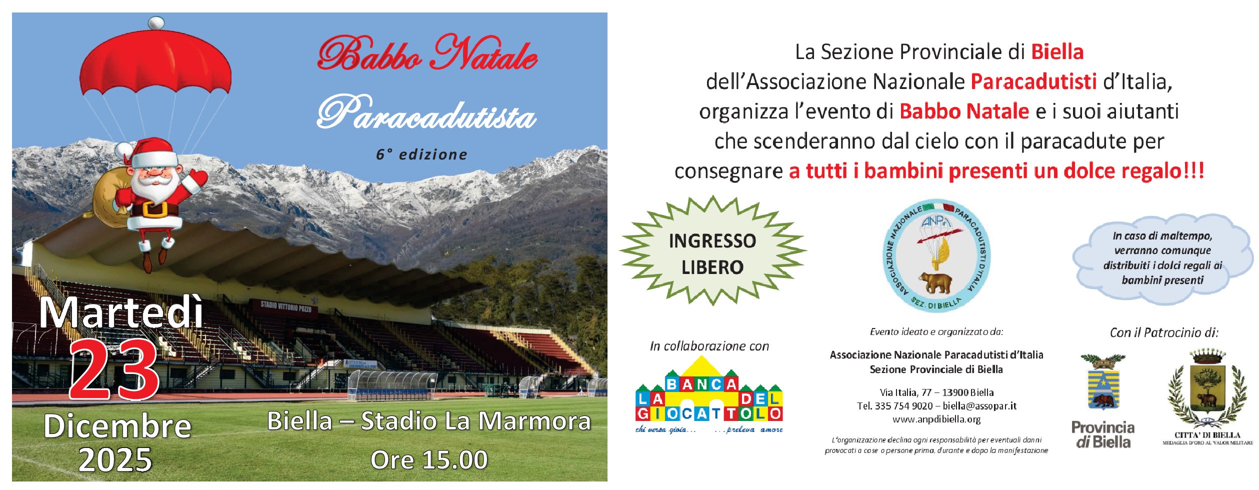 L’evento si svolgerà a partire dalle ore 15.00 presso lo Stadio La Marmora di Biella, dove Babbo Natale e i suoi aiutanti scenderanno dal cielo con il paracadute, regalando uno spettacolo unico e suggestivo.