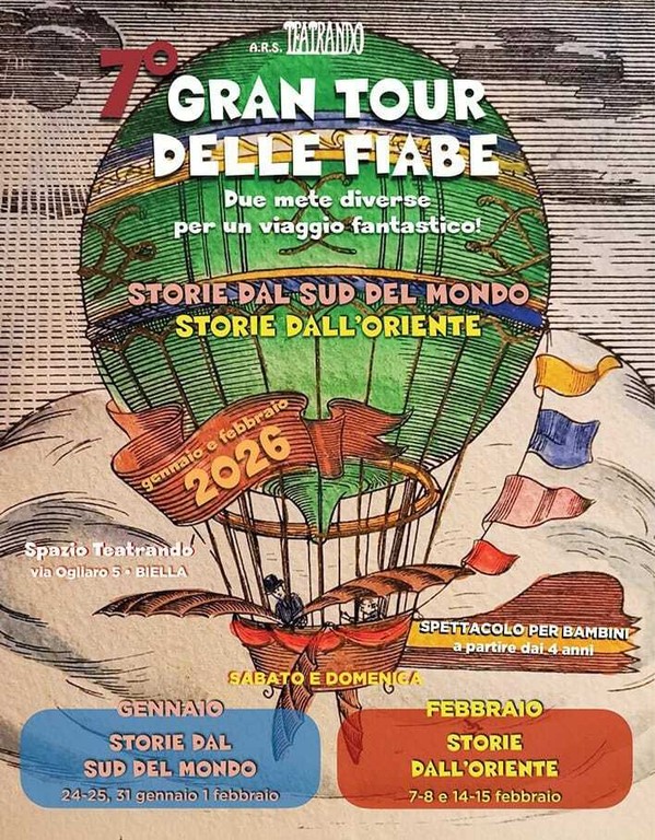 Un viaggio che non richiede valigie né biglietti aerei, ma solo la disponibilità a lasciarsi guidare dall’immaginazione. A Biella torna il “Gran Tour delle Fiabe”, l’appuntamento che la compagnia Teatrando dedica ogni inizio d’anno ai più piccoli, trasformando la propria sede di via Ogliano in una porta d’accesso a mondi lontani.