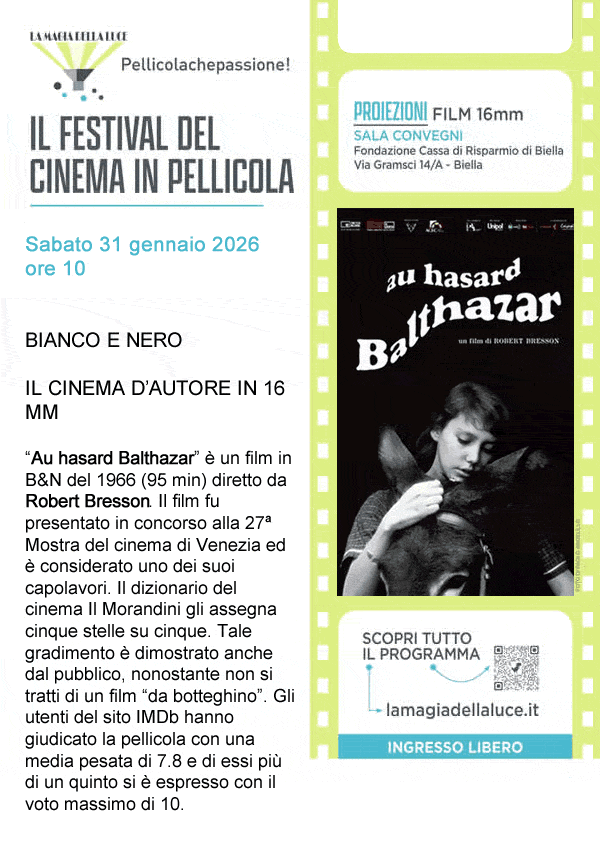 In programma la proiezione del film in bianco e nero “Au hasard Balthazar” (1966) di Robert Bresson, presso la Sala Convegni della Fondazione Cassa di Risparmio di Biella (via Gramsci 14/A).