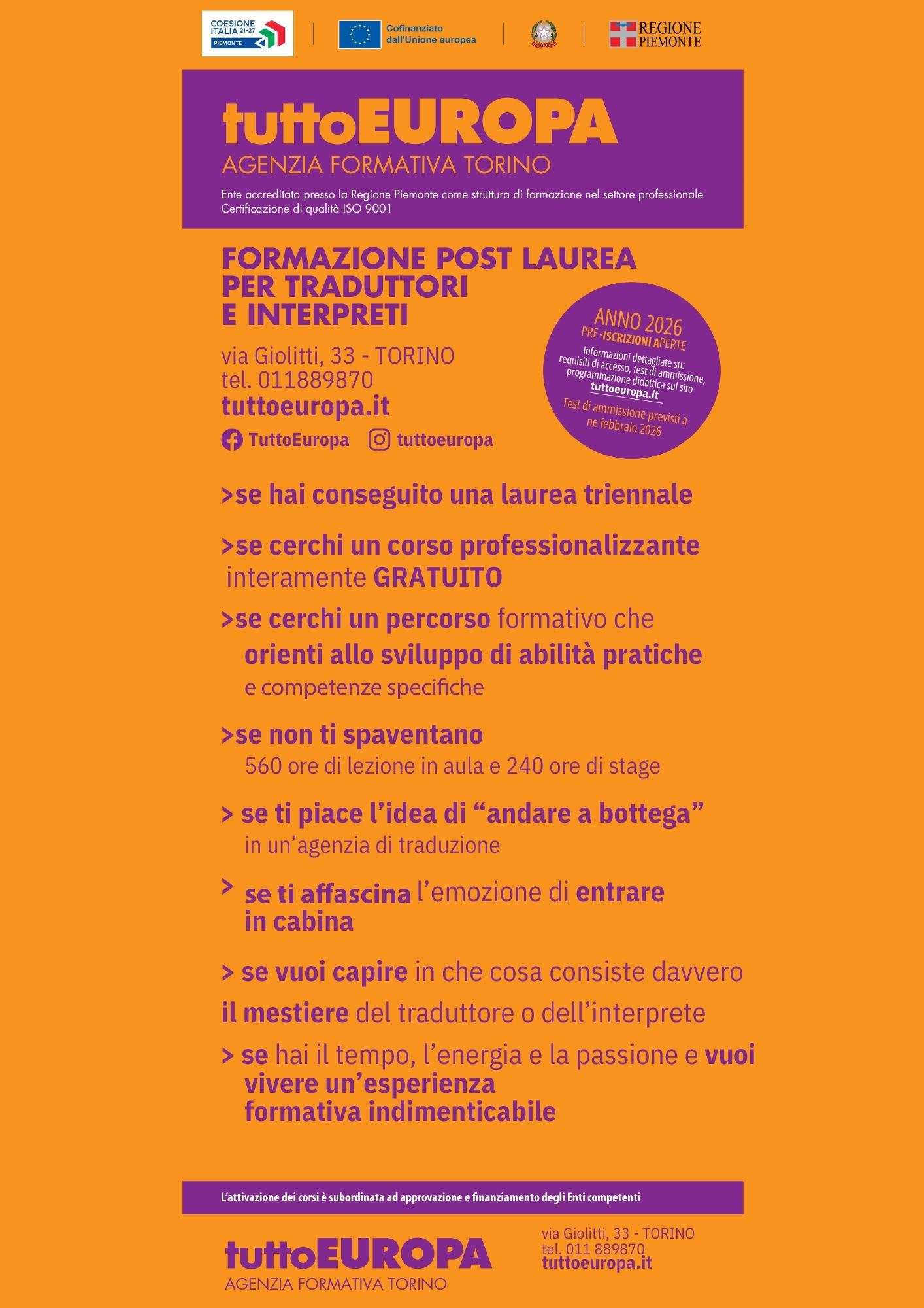 Per chi ha conseguito una laurea triennale ed è interessato a trasformare le competenze linguistiche in una professione concreta, TuttoEuropa – Agenzia Formativa di Torino – propone un percorso post laurea gratuito per traduttori e interpreti, in partenza nel 2026.