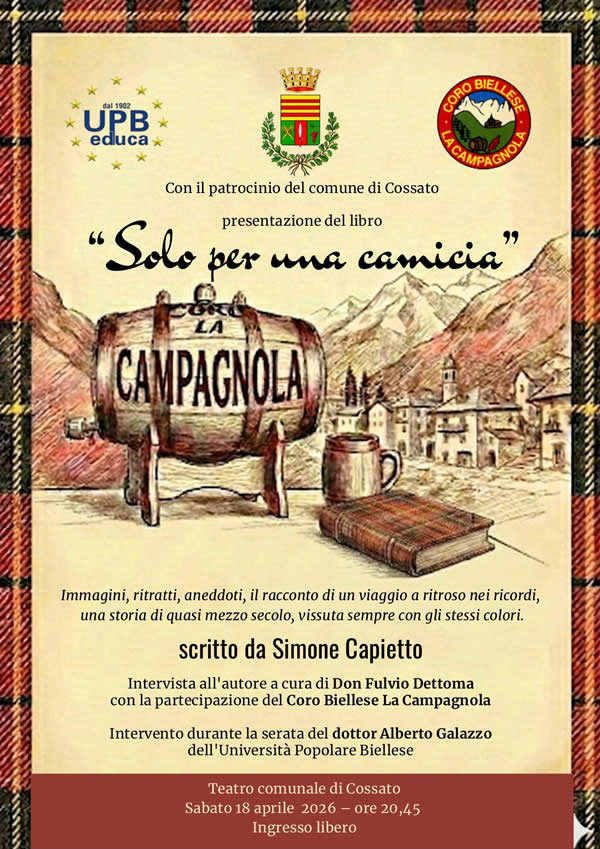 Sabato 18 aprile 2026 alle ore 20:45, presso il Teatro Comunale di Cossato, si terrà la presentazione del libro “Solo per una camicia” di Simone Capietto, organizzata dal Coro Biellese La Campagnola.