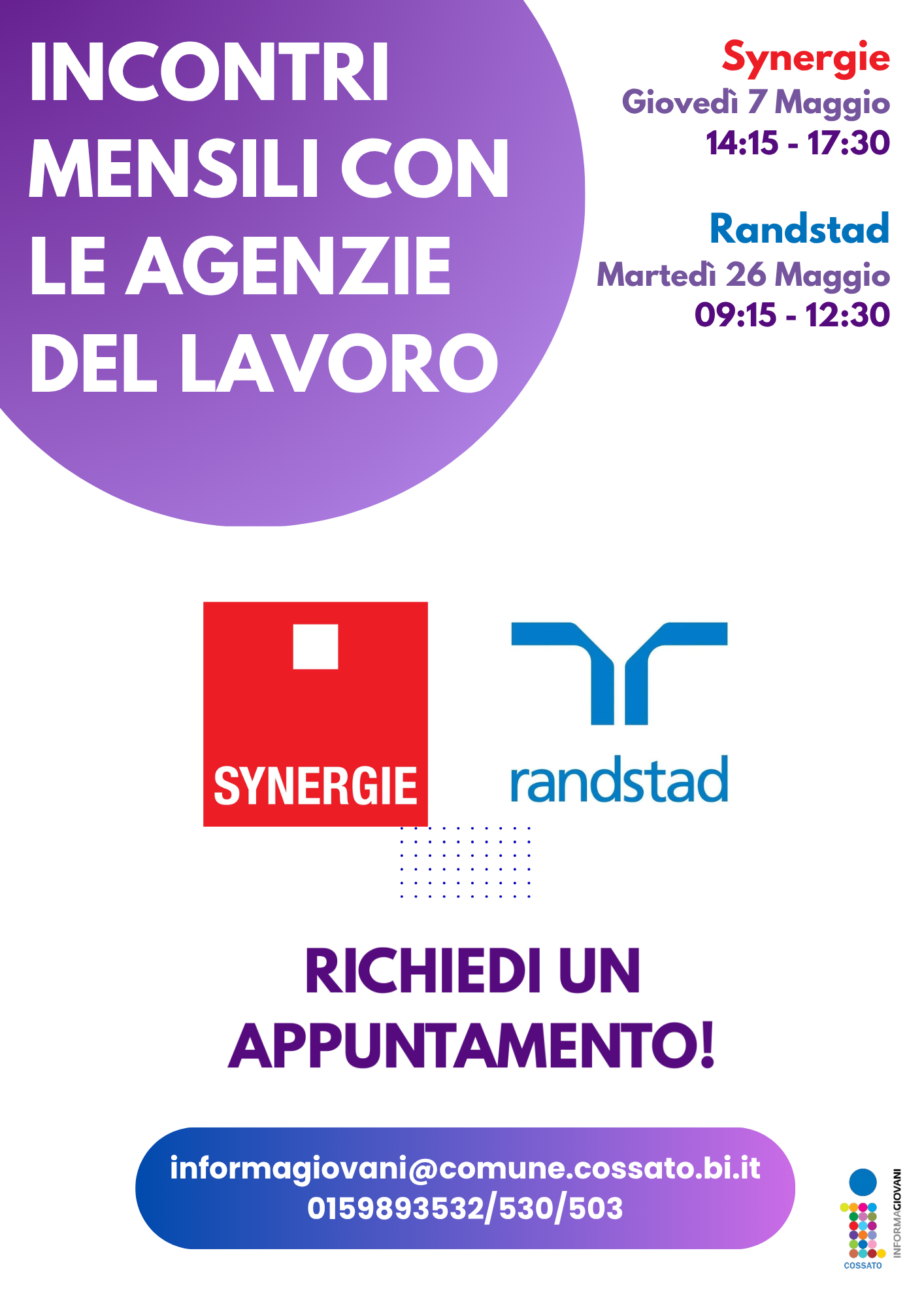 Si informa l’utenza che è possibile incontrare le agenzie del lavoro presso la nostra sede in Via Ranzoni 24, Cossato, nelle seguenti date: